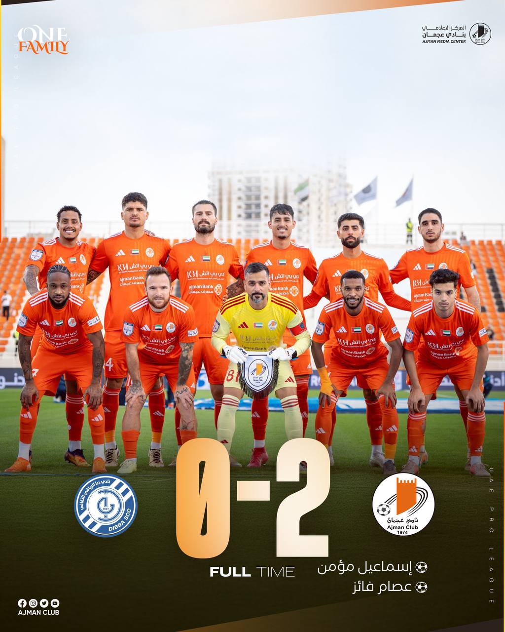 Ajman defeated Dibba 2–0 in the match held today as part of Round 9 of the ADNOC Pro League at Rashid bin Saeed Stadium.